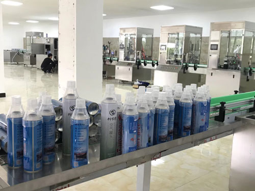 針對產量比較高,有穩定、廣泛的銷售渠道,大量生產的企業,我們推薦上全自動空氣灌裝生產線,整條線由理瓶臺、上閥、封口、充氣、水浴檢測、稱重、扣噴嘴、扣大蓋、貼標打碼、封箱打包等組成。生產效率高,自動化程度高,同時還能節省工人。