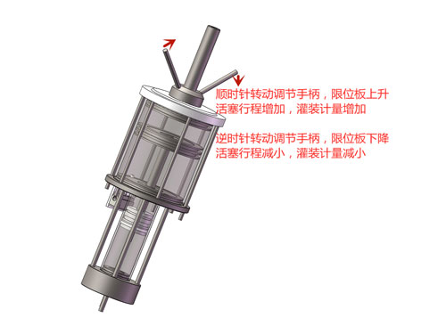 (6)調灌液計量:灌液機計量調節??梢酝ㄟ^旋轉灌液計量缸頂部的調節旋柄來調節計量缸氣缸定位活塞的高度,從而改變計量缸活塞的行程來最終改變灌裝的計量大小。(注意,在調節前,要關閉主機氣源和計量缸上行氣處的手滑閥,并等待設備中壓縮空氣排空,否則無法轉動旋柄。最好是由小往大調節計量(順時針轉動手柄,增加計量),如果是從大往小調節(逆時針轉動手柄,減小計量),而且調節的幅度較大,可能會出現調節一段距離后旋柄再無法再繼續轉動的情況,此時則需要將灌液頭的灌液嘴向上頂一下,適當排出一點液體即可繼續調節了。先將計量調節到一個大概的位置,進行試灌裝,然后根據灌裝量來進行調整計量,直至計量達到所需要求。